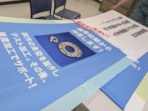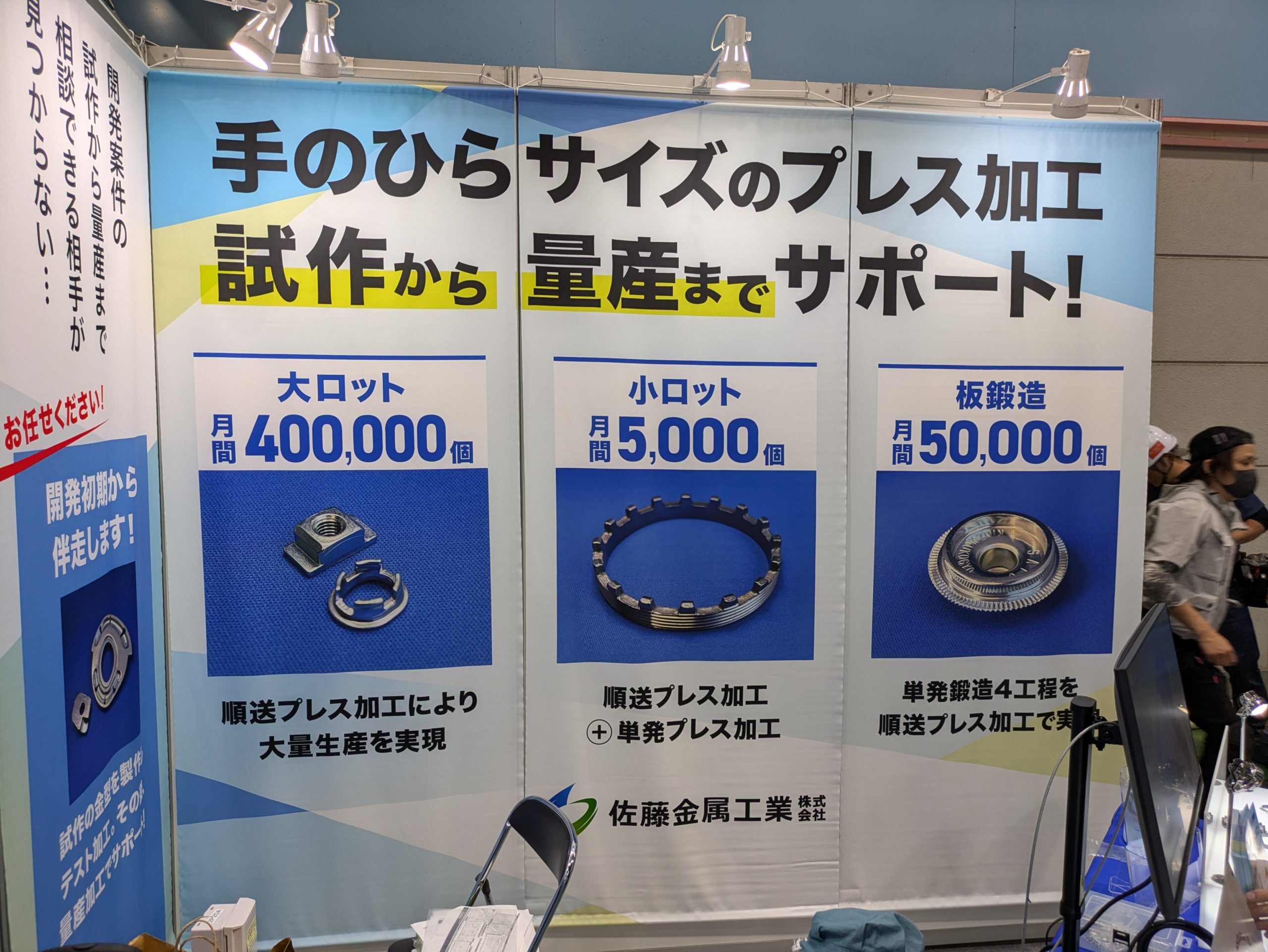 金属プレス加工を手掛ける佐藤金属工業株式会社では、角小間ブースの正面と側面の2面を活用し、計6枚のタペストリーで白いパネルを覆う構成としました。
